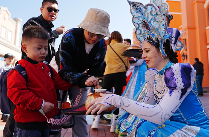 服務是旅游業的靈魂。后疫情時代,游客對于旅游服務提出了更高的要求。泰達航母積極踐行以游客為中心的服務理念,以高品質的服務演繹疫情后的首次“華麗轉身”。為給廣大游客提供一個煥然一新的游園環境,公司搶抓工期,修繕俄羅斯風情街,為風情街重新換上了亮麗的“新裝”。為營造“未出國門˙便入俄境”的獨特游覽氛圍,公司邀請金發碧眼的俄羅斯姑娘與小伙為游客獻上俄羅斯面包蘸鹽歡迎禮,并奉上獨具風情的俄羅斯歌舞表演,以最熱烈的氛圍迎接廣大游客的到來。